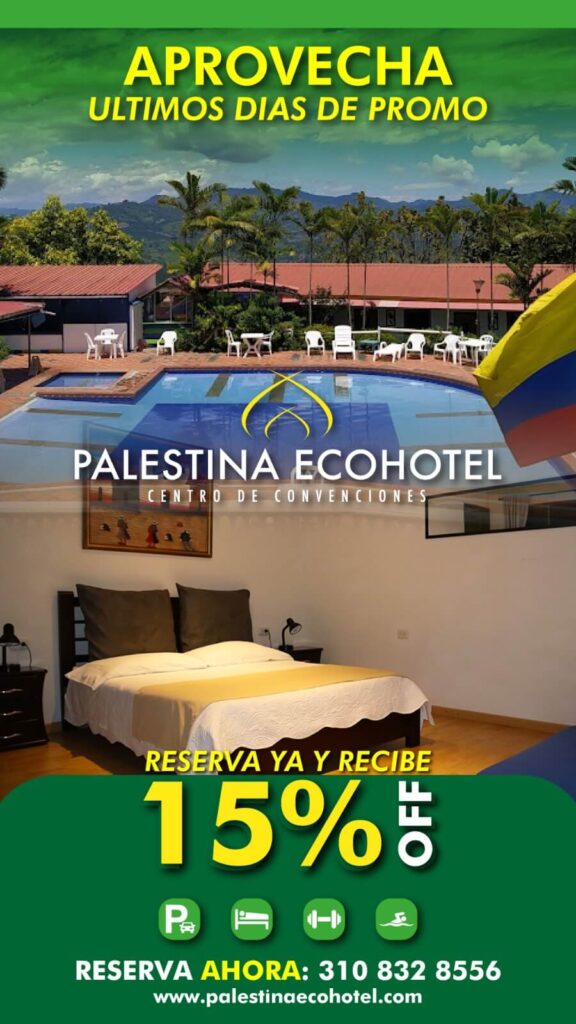 Palestina Ecohotel Centro de Convenciones está ubicado en el municipio de Palestina en el hermoso departamento de Caldas, territorio del Paisaje Cultural Cafetero, Patrimonio de la Humanidad. Disfruta del sol, del aire puro, y el espectacular paisaje que esta maravillosa tierra cafetera puede ofrecerte. Encuentra alojamiento en fantásticas habitaciones, diviértete en nuestras áreas comunes, piscina, jacuzzi y áreas verdes. Experimenta el avistamiento de aves y especies endémicas de este hermoso rincón de Colombia.